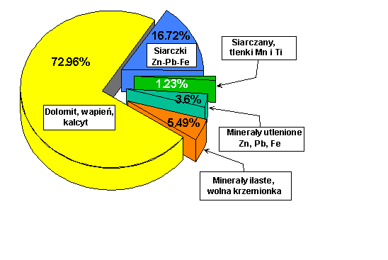 Znaczna część badanych rud utlenionych zawiera niewielkie ilości smitsonitu, cerusytu czy limonitów, co odróżnia je od typowych galmanów znanych z rejonu bytomskiego (Zawiślak i Kubica 1970). Rudy utlenione z rejonu olkusko-zawierciańskiego charakteryzują się wysokim udziałem dolomitu oraz nierozłożonych siarczków Zn-Pb-Fe (rys. 3), a także brakiem krzemianu cynku-hemimorfitu (Cabała 1993). Zawartości dolomitów i siarczków są 2 do 3 razy wyższe w porównaniu do galmanów opisywanych z rejonu bytomskiego przez Żabińskiego (1960)