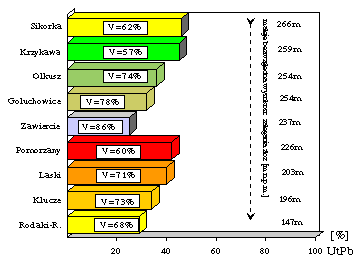 Rys.1. Histogram średnich wartości stopnia utlenienia siarczków ołowiu (UtPb) w złożach.